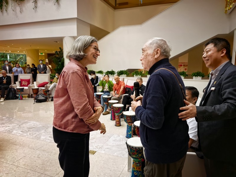 在互动环节中,参访团体验“鼓圈”互动,沉浸式体验表达性艺术治疗。81 岁的在住长者梁宇爷爷,更是用法语与西班牙、瑞士的学者现场交流,并展示了自己挂在社区走廊的画作。“搬到这里后,孤独感少了,能看病、能画画、能和朋友聊天,就像在家一样自在。”一个个日常生活的细节,让老人感受到“被关注、被尊重、被需要”。