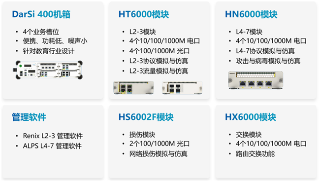 包括L2-3模块,L4-7模块,网络损伤模块,三层交换模块。通过灵活配置这些模块,可以满足通信网络与网络安全专业教学中各种实验,从而达到深挖网络原理,贴近教学实践的目的。