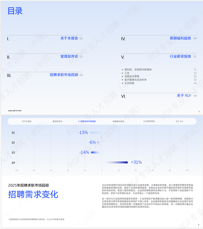 《RGF薪酬观察2026》系列报告(以下简称“本报告”)及与之相关的所有知识产权及衍生权利均归属于RGF国际招聘(以下简称“RGF”)所有。本报告仅限通过RGF官方渠道或RGF授权渠道(统称“RGF官方授权渠道”)获取并用于个人或企业内部用途。未经RGF事先书面授权,任何个人或企业不得:将报告内容用于商业目的;通过非RGF官方授权渠道进行推广或传播;向公众或第三方提供本报告的下载服务。对于任何侵权行为,RGF将依法追究法律责任。鉴于报告中部分数据具有实时动态属性,建议使用者在参考时结合实际情况进行审慎研判。本报告所载内容仅供决策参考,RGF不对基于本报告做出的任何商业决策结果承担责任。